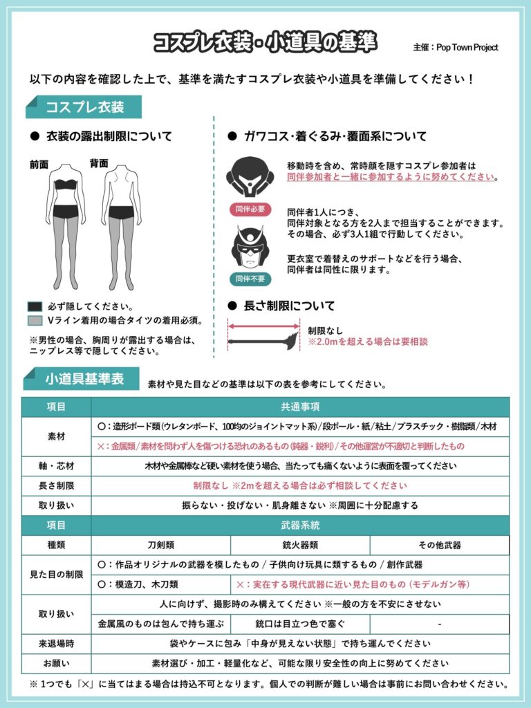 ※コスプレ衣装や撮影機材、店舗への入店・店内撮影の可否についてのルールは会場ごとに制限・緩和される場合がありますので、個別イベントのWebページで追加ルールを必ず確認してください。