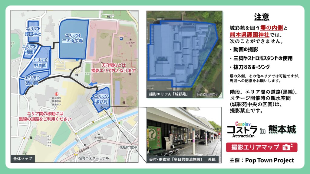 ・ 「城彩苑の壁の内側」と「熊本県護国神社内」 で三脚・ストロボスタンドなど地面に置いて使う機材を使った撮影は禁止です。