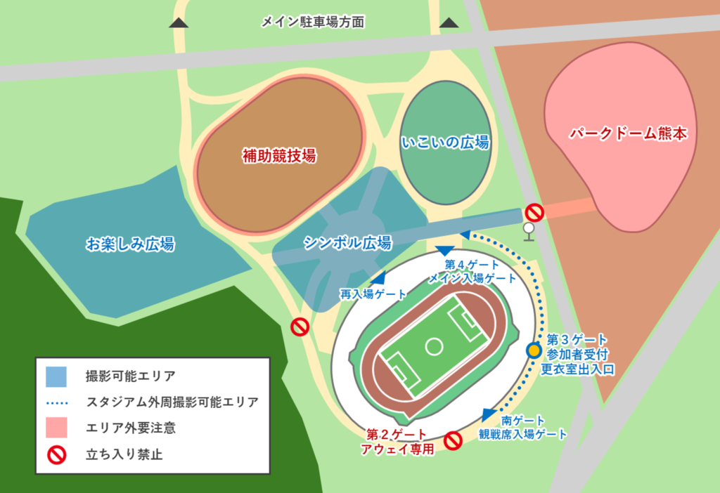 ・撮影可能範囲はえがお健康スタジアムピッチ内(時間限定)、スタジアム内メインスタンド側コンコース、スタジアムグルメ広場、いこいの広場、おたのしみ広場、スタジアム外周部です。