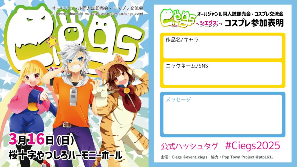 Pop Town Projectは熊本県八代市で開催されるオールジャンル同人誌即売会・コスプレ交流会「Ciegs」にコスプレ部門の運営で協力します!
