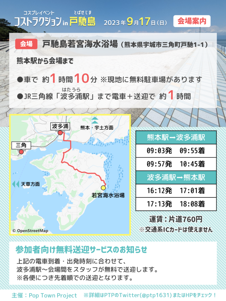 PopTownProjectは宇城市役所三角支所に許可をいただき、戸馳島でコスプレイベントを開催します。