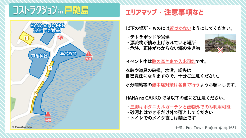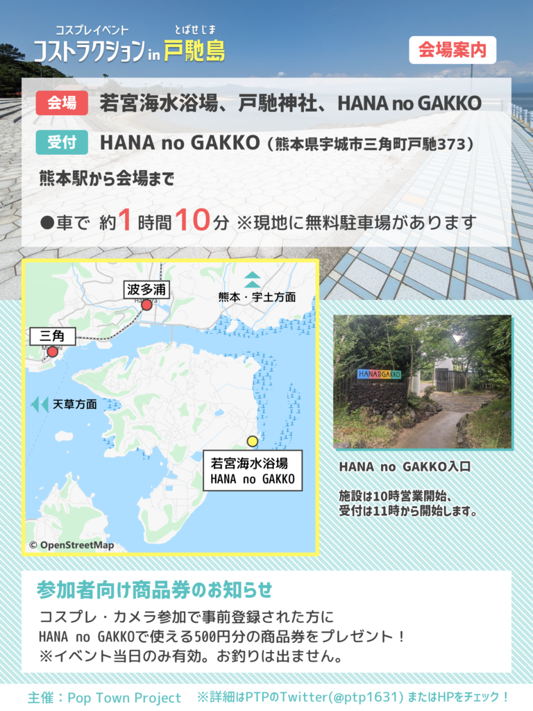 Pop Town Projectは宇城市役所三角支所の許可とHANA no GAKKOの協力をいただき、戸馳島でコスプレイベントを開催します。