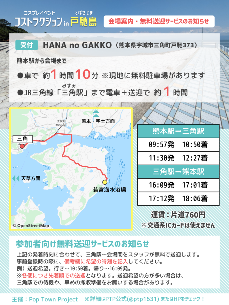 本イベントの参加者を対象に、JR三角線「三角駅」~会場間をスタッフが無料で送迎します。